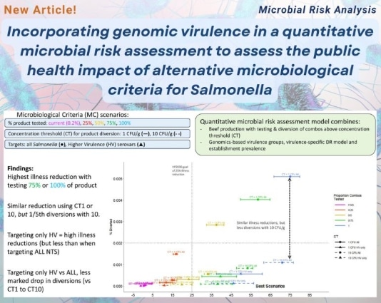 New Article in Microbial Risk Analysis titled: Incorporating genomic virulence in a quantitative microbial risk assessment to assess the public health impact of alternative microbiological criteria for Salmonella, introduces a novel Quantitative Microbial Risk Assessment (QMRA) model that evaluates Non-Typhoidal Salmonella (NTS) illness reductions under various microbial criteria scenarios in beef production.